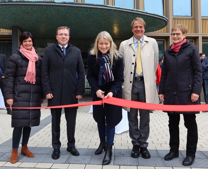 Mit einer kleinen Feierstunde wurde am 15. November 2024 der neue Vorplatz des Fachgerichtszentrums Osnabrück (Arbeitsgericht Osnabrück, Sozialgericht Osnabrück, Verwaltungsgericht Osnabrück) von der Niedersächsischen Justizministerin Dr. Kathrin Wahlmann eingeweiht. Das Fachgerichtszentrum Osnabrück war bisher nicht barrierefrei zugänglich. Das Staatliche Baumanagement Region Nord-West hat neben der Treppenanlage nun eine rollstuhlgerechte Rampe geschaffen und gleichzeitig den Vorplatz neu gestaltet. Mit dem neuen Eingangsbereich hat das Baumanagement ein bauliches Gegengewicht zu dem prägnanten, denkmalgeschützten Bestandsbau aus den 1950er-Jahren geschaffen. Bei den Bauarbeiten wurden die Überreste eines vorhandenen Stadthauses freigelegt, die zunächst durch die Stadtarchäologie kartografiert und im Anschluss zeitaufwändig abgetragen wurden. Die Ministerin zeigte sich erfreut, dass nun insbesondere in einem Fachgerichtszentrum, in dem häufig auch Menschen mit Beeinträchtigungen ihre Rechte geltend machen, diese denselben Zugang haben wie alle. Der Bau sei gut gelungen und zeige umso mehr, wie gut die drei Gerichte täglich zusammenarbeiten. |